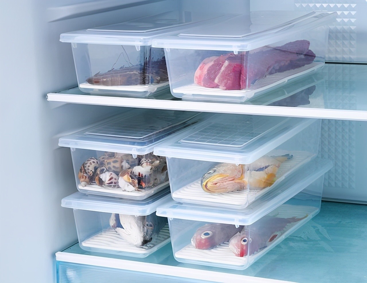 建议家里可以多准备一些冰箱保鲜盒,可以分类装不同的食材,不仅隔绝了互相污染而且冰箱更整齐了,找东西也方便。尽量选择带有沥水片的保鲜盒,能够沥掉海鲜或者肉类中的水分,可以保鲜更久。