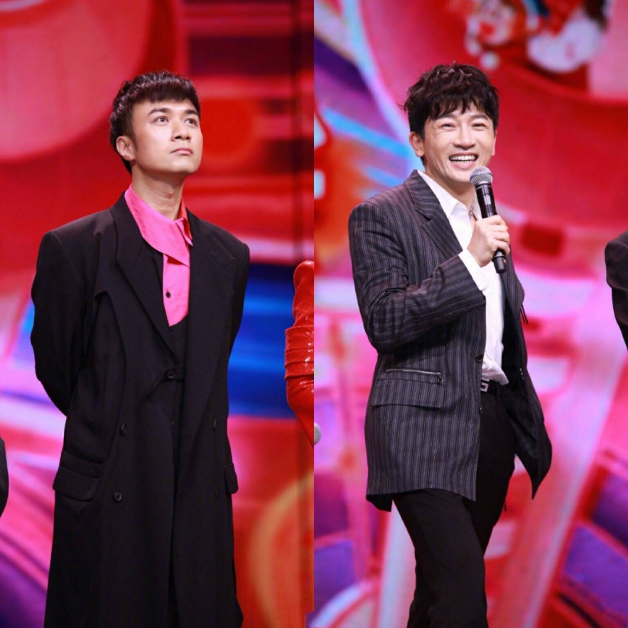 那么多年过去了古巨基还是帅的人神共愤。玫红色和黑色拼接的衬衫,领口是不规则的剪裁显得很有设计感。外面叠穿一件黑色的长款风衣,长至小腿的长度显得古巨基又瘦又高。脚上搭配一双黑色的皮鞋,这身行头再来一顶礼帽完全可以去演许文强了。