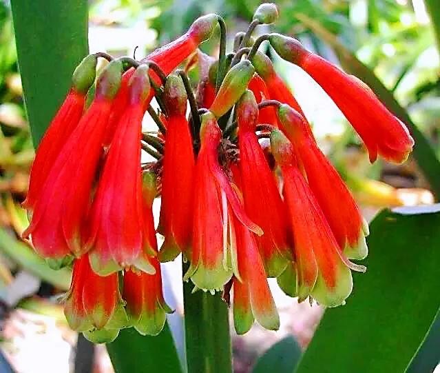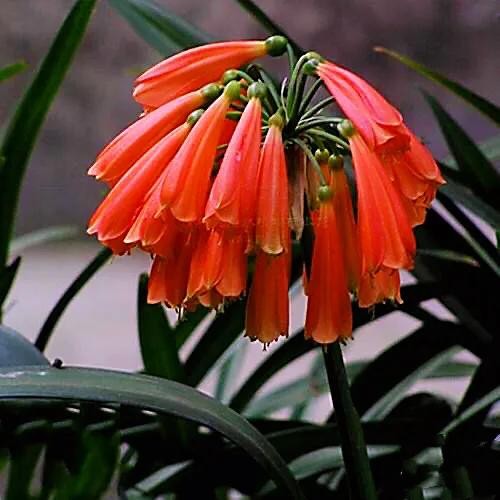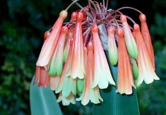 伞形花序顶生,花葶从叶丛中抽出,花葶粗壮,高20-50厘米,着花7-40朵。有一葶多花,基部合生短简,呈漏斗形。花型较大,故称"大花君子兰"。