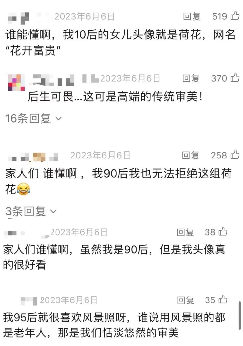 “我10后的女儿头像就是荷花”“90后也无法拒绝”“95后就很喜欢风景照呀”“23岁的小伙表示又有头像可以换了”。