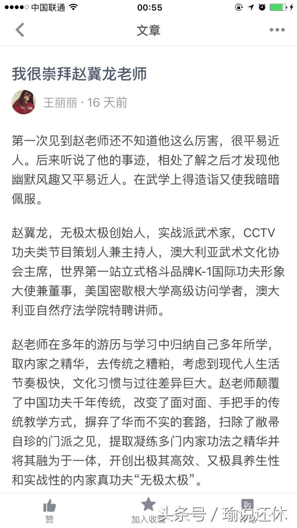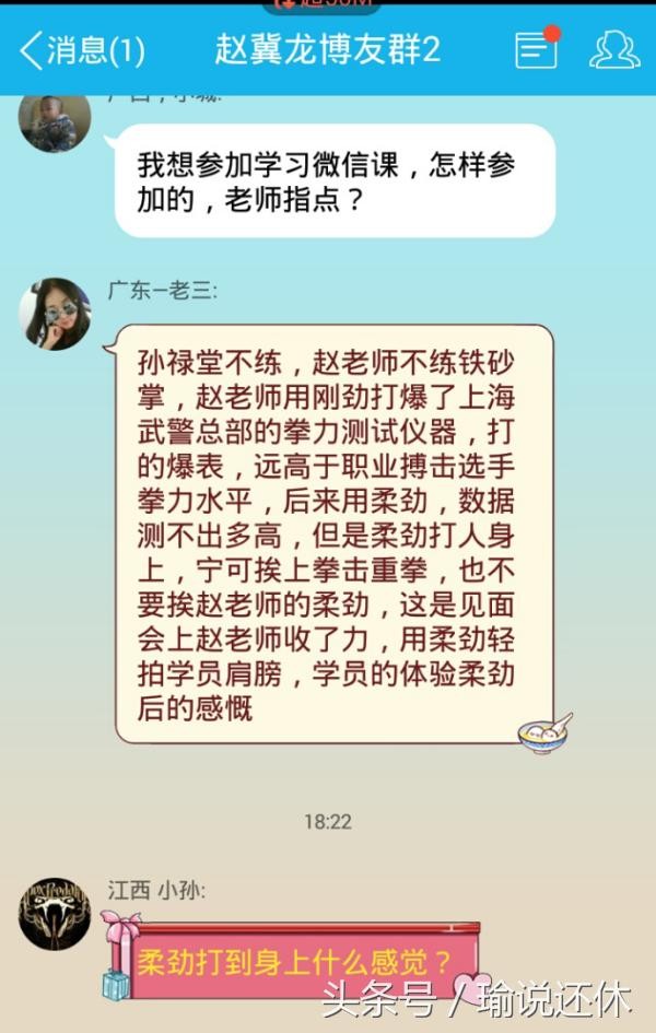 其中一个介绍上说,赵冀龙曾邀请专业拳手,用拳力击打自己腹部,他一边承受重拳,一边若无其事地喝矿泉水。