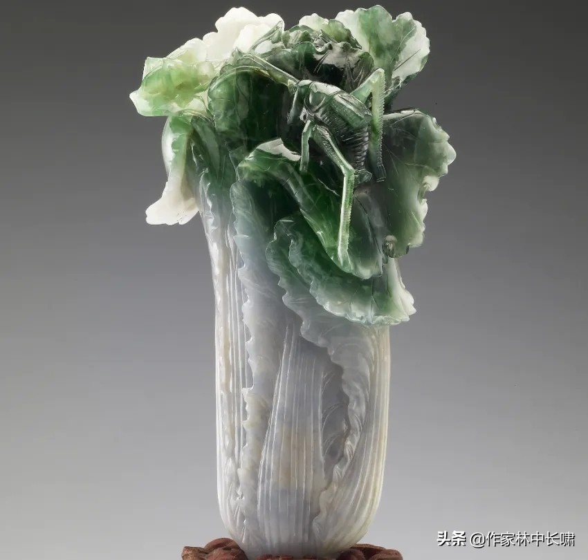 著名的清代玉雕“翠玉白菜”,长18.7厘米, 宽9.1厘米, 厚5.0厘米 。是在一整块半白半绿的天然翠玉上,根据玉料天然的色泽巧妙雕刻出的白菜形状的玉器。洁白而筋脉分明的菜身,翠绿而自然翻卷的菜叶,叶片上停留的触角清晰的螽斯和蝗虫,无不鲜活生动,与真实白菜相似度几乎为百分之百。