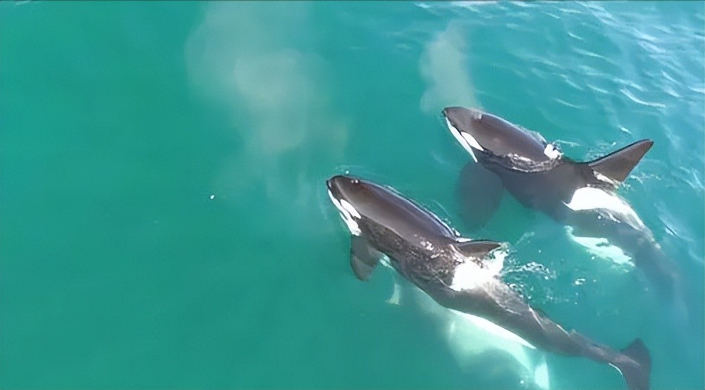 虎鲸群体都会有着一只雌性虎鲸作为领导者,将群体成员进行明确的分工,这个群体也不例外。雄性的责任就是负责外出觅食,找到目标后,就带领其它雄性成员对其进行捕杀。这时,两只雄性虎鲸正脱离群体,向着远方游去寻找着虎鲸幼崽今天的午餐。