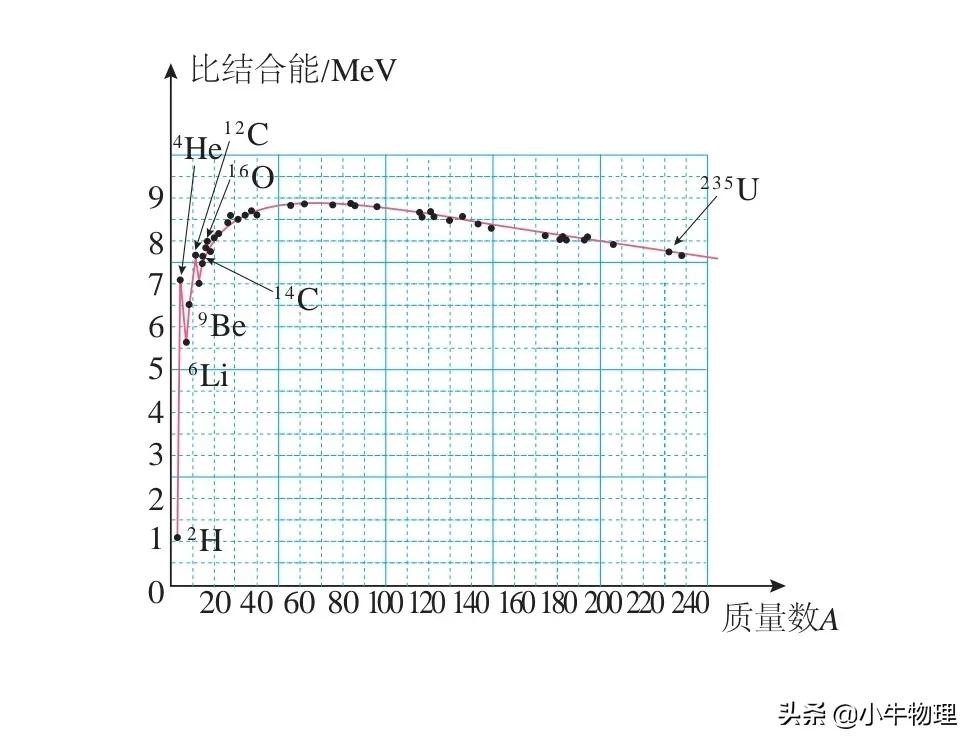 比结合能,就是平均每个核子释放出来的能量,释放出来的越多,平均每个核子剩下的能量就越少,由E=mc²可知,平均每个核子的质量也就越小,如右图所示,其中⁵⁶₂₆Fe原子核的平均核子质量最小。