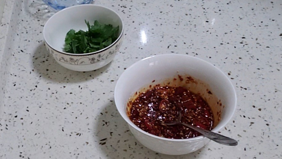 第五、准备凉拌藕丁的调料。将老姜、大蒜剁成沫,装进碗里,加入味精、鸡精、胡椒粉、盐、辣椒面、干(湿)辣椒段、花椒油、生抽等调料,同时加入切成小段的大蒜苗和香菜,拌匀配料沫。当然,朋友们也可以将藕丁与其他辅助食材搭配,纯属个人喜好,不可千篇一律。这是做特色凉拌藕丁的关键。