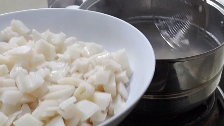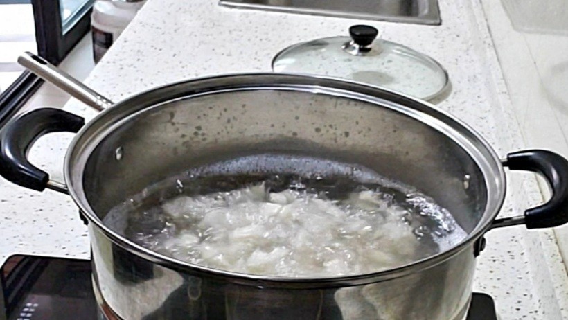 第三、藕丁焯水。开水锅里放入少许食盐后加入藕丁,大火煮2分钟。期间,用铲子或勺子舀下锅里煮的藕丁,使其均匀受热,这是做凉拌藕丁的核心。这也是为何许多朋友做出来的凉拌藕丁容易黑、苦、硬,口感欠佳的重要原因。放入开水锅里焯水2分钟,以确保其清脆和鲜嫩。