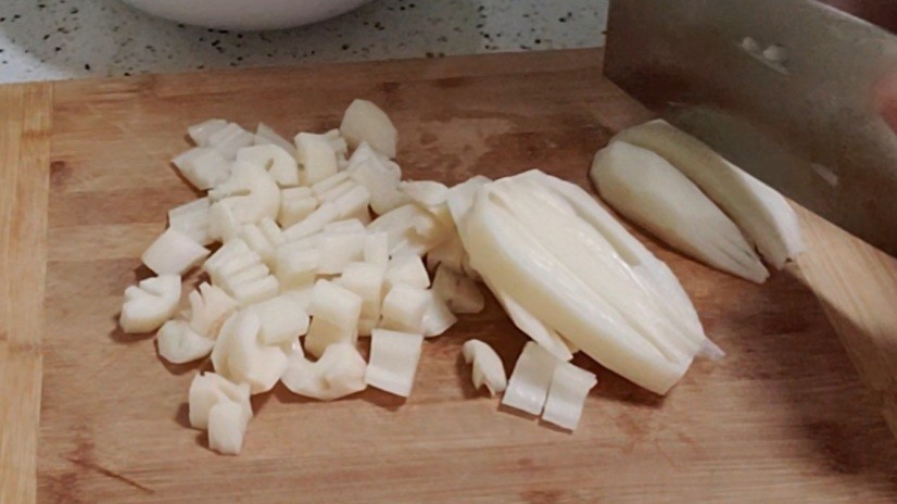 第二、莲藕切成藕丁。将莲藕去皮、洗净后去掉两头不要,对半切开再切成藕丁。