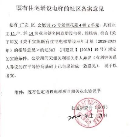 经广安市广安区景湖花苑4幢2单元14名业主全部签名同意增设电梯,现委托四川至上电梯安装工程有限责任公司向自然资源和规划局申请在该单元增设一部电梯,电梯高度25.8米,离建筑外墙面7.1米。
