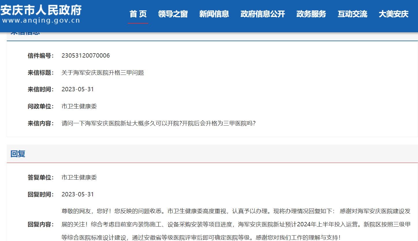 市民再安庆市政府网站咨询:海军安庆医院新址大概多久可以开院?开院后会升格为三甲医院吗?