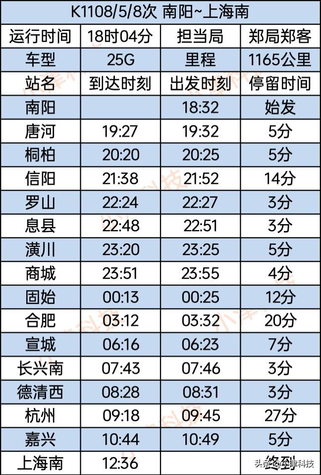 南阳站至上海南站运行17小时56分,使用车次为K1108/1105次,经停南阳、唐河、桐柏、信阳、罗山、息县、潢川、商城、固始、合肥、宣城、长兴南站、德清西站、杭州、嘉兴、上海南。