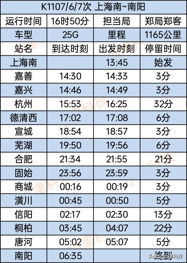 上海南站至南阳站运行16小时34分,使用车次为K1107/1106次,经停上海南、嘉善、嘉兴、杭州、德清西、宣城、芜湖、合肥、固始、商城、潢川、信阳、桐柏、唐河、南阳。