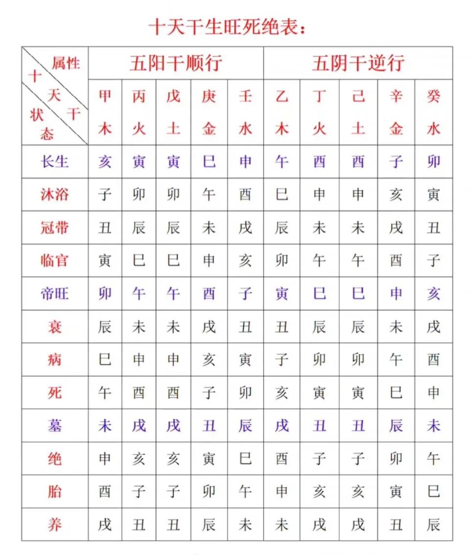 以上是十二长生的规律表,给大家介绍一下其中的规律。首先横排是十天干,竖排是每个天干基于十二长生不同的阶段变化,正好可以跟十二地支对应上,十二长生,都是从长生这个状态开始,依次排列到养这个状态结束。