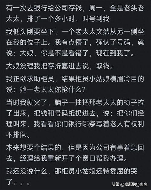 “银行存钱遇老太插队,柜员帮老太,我找经理解决。”