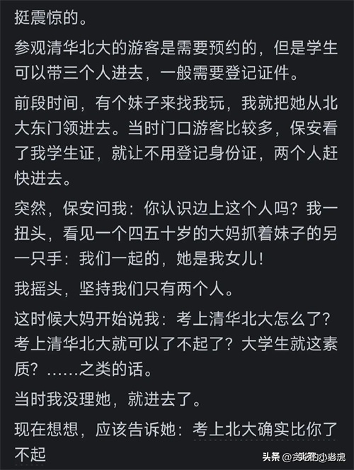 “带妹子进北大被大妈冒充家属,没理她进去了。”