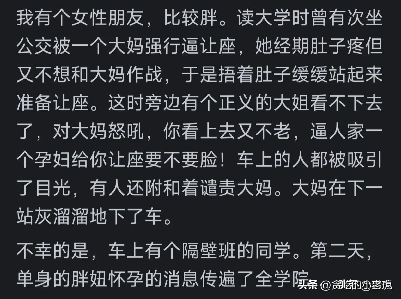 “胖朋友被大妈逼让座,被误认孕妇,消息传遍学院。”