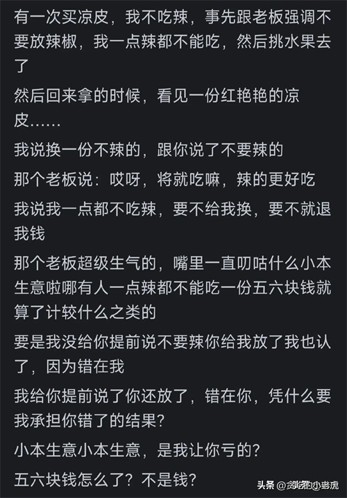 “买凉皮强调不要辣却放辣,老板不愿换退,被怼。”