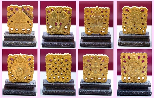 八宝则分别指八种事物:宝伞,象征消除烦恼炎热,赐予无烦清凉;双鱼,双目大而圆,象征获得慧眼;宝瓶,内有长寿甘露和如意树,象征财源不断,事事如意;莲花,象征高洁品德和圆通智慧;右旋白海螺,闻其声者不堕地狱,是清净法音传遍世界的象征;如意结,象征万事如意和圆通无碍:宝幢,是古印度象征胜利的旗帜,寓意战胜四魔(天魔、五蕴魔、烦恼魔、死亡魔);八辐金轮,是古印度传说中统治宇宙的转轮王的手中法宝,象征战胜三界烦恼之敌,到达清净彼岸。