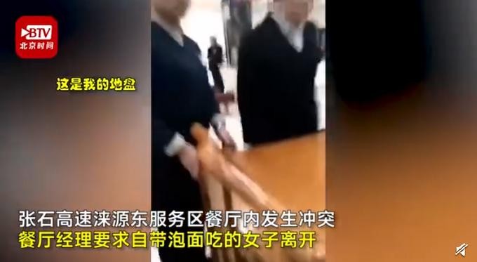 15日,河北张石高速涞源东服务区餐厅,餐厅经理要求自带泡面吃的女子离开。女子称是在服务区超市买的泡面,餐厅没权赶她,经理高喊“这是我的地盘。”服务区:已对餐厅经理进行批评教育及罚款。