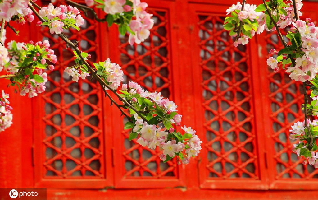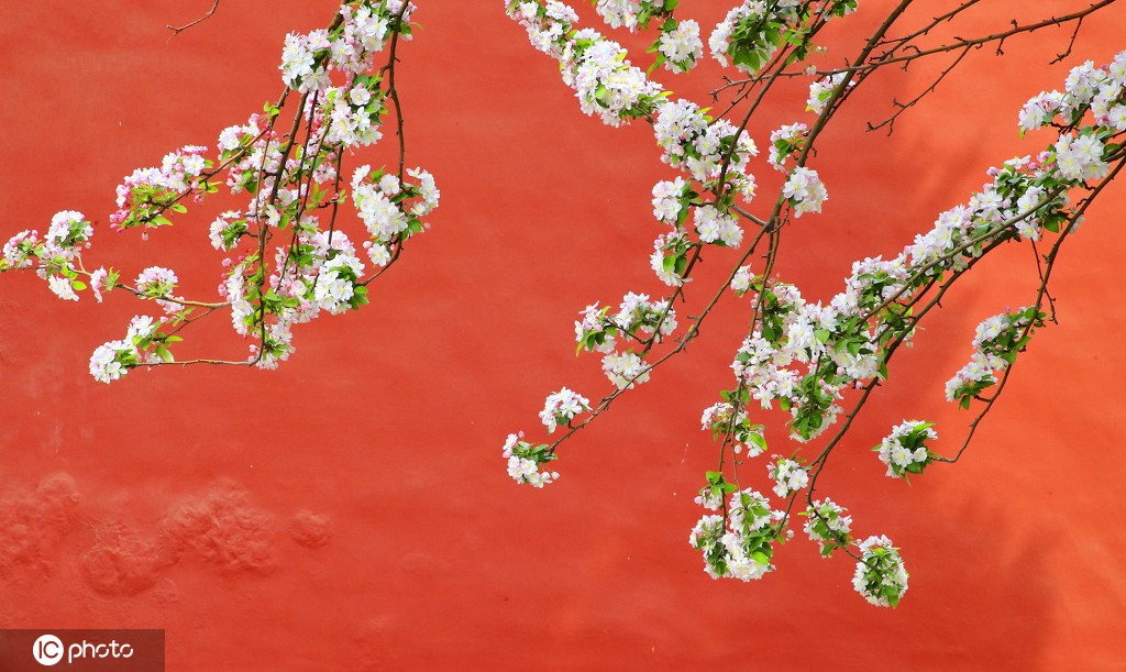 2021年4月5日,北京故宫文华门海棠花开,美不胜收。