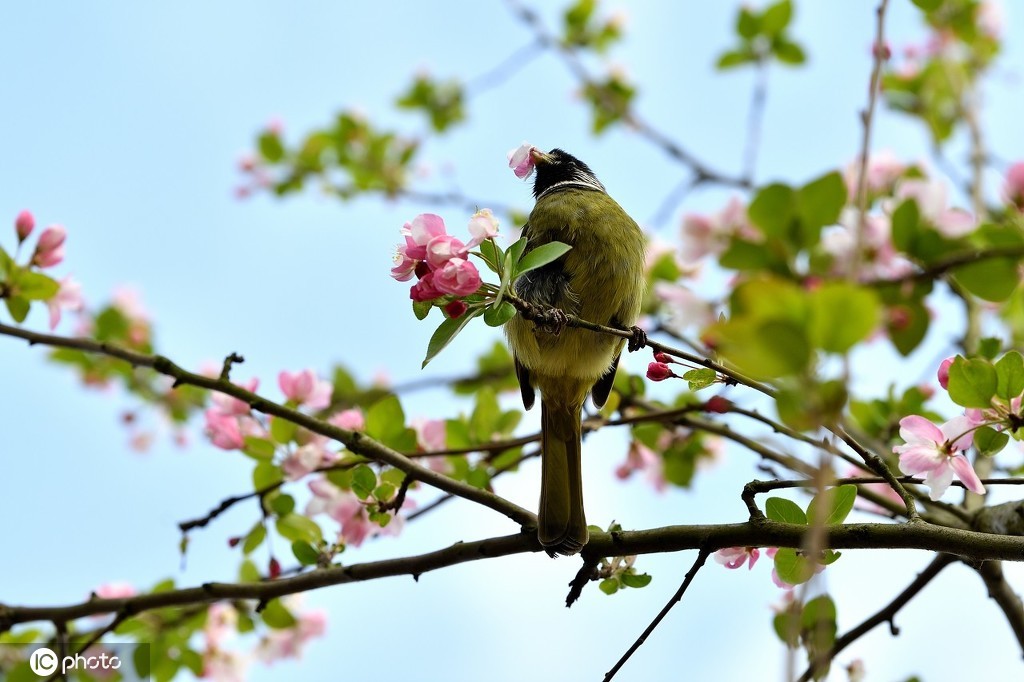 3月11日,在湖北省襄阳市保康县清溪河景观公园,小鸟在海棠花枝头驻足。