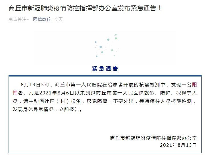 8月13日5时,商丘市第一人民医院在给患者开展的核酸检测中,发现一名阳性者。凡是2021年8月6日以来到过商丘市第一人民医院就诊、陪护、探视等人员,请主动向社区(村)报备,居家隔离,不要外出,等待疾控人员核酸检测,发现身体异常情况,立即报告。