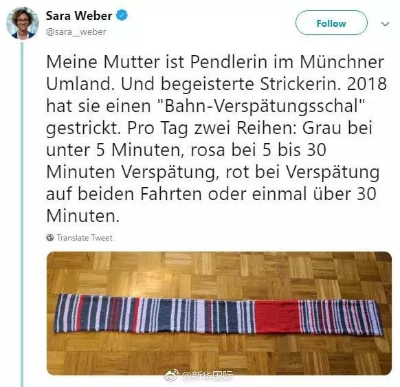 对经常在德国乘火车的人来说,晚点是个无力吐槽的话题。德国一位阿姨花了一年时间,织了一条德铁晚点围巾,来记录她2018年每天通勤时遇到的晚点情况:每天织两行,晚点5分钟以内用灰色毛线、5分钟到30分钟用粉色毛线,要是来回两趟都遇到晚点或者晚点超过30分钟就用红色毛线。一年的成果是这样的↓↓↓这条围巾被放到ebay上拍卖,目前已经被拍到1370欧元。(新华国际)