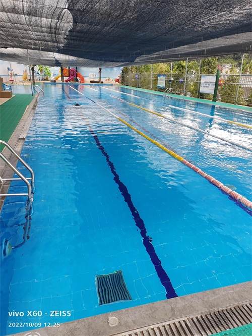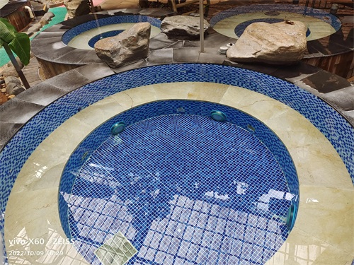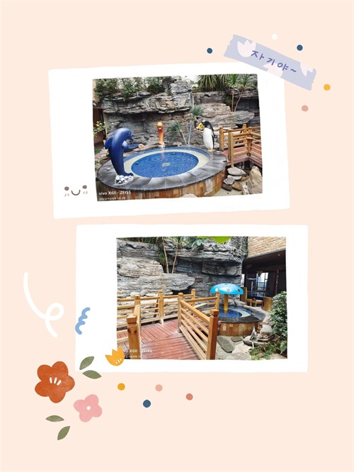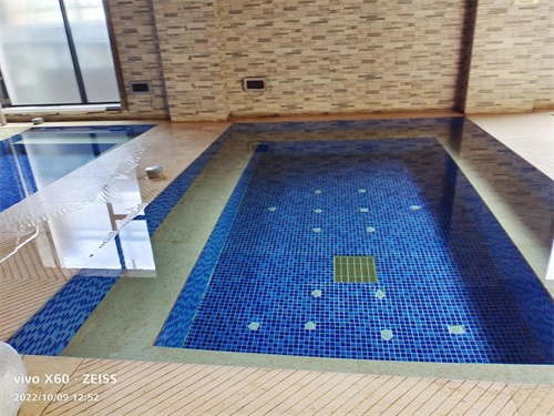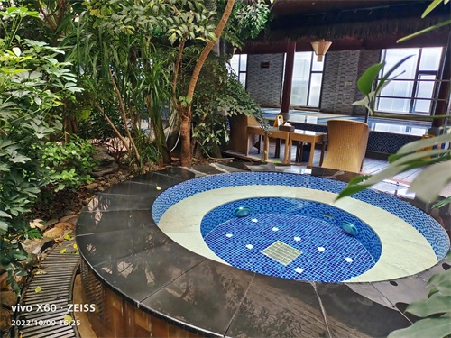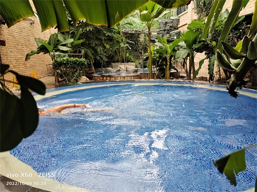 游泳池的水也是热的温泉水。深水区170cm,浅水区140㎝,浅水区旁边有个娃娃游的小池子,上面有个滑梯。