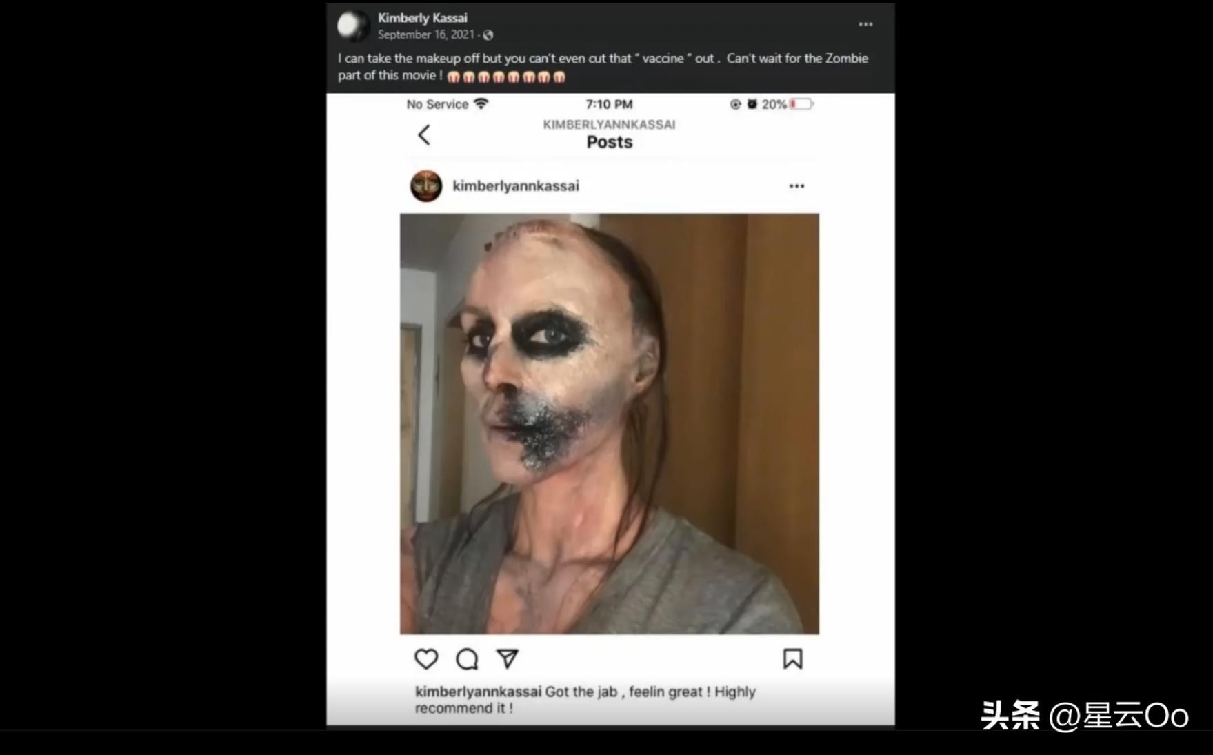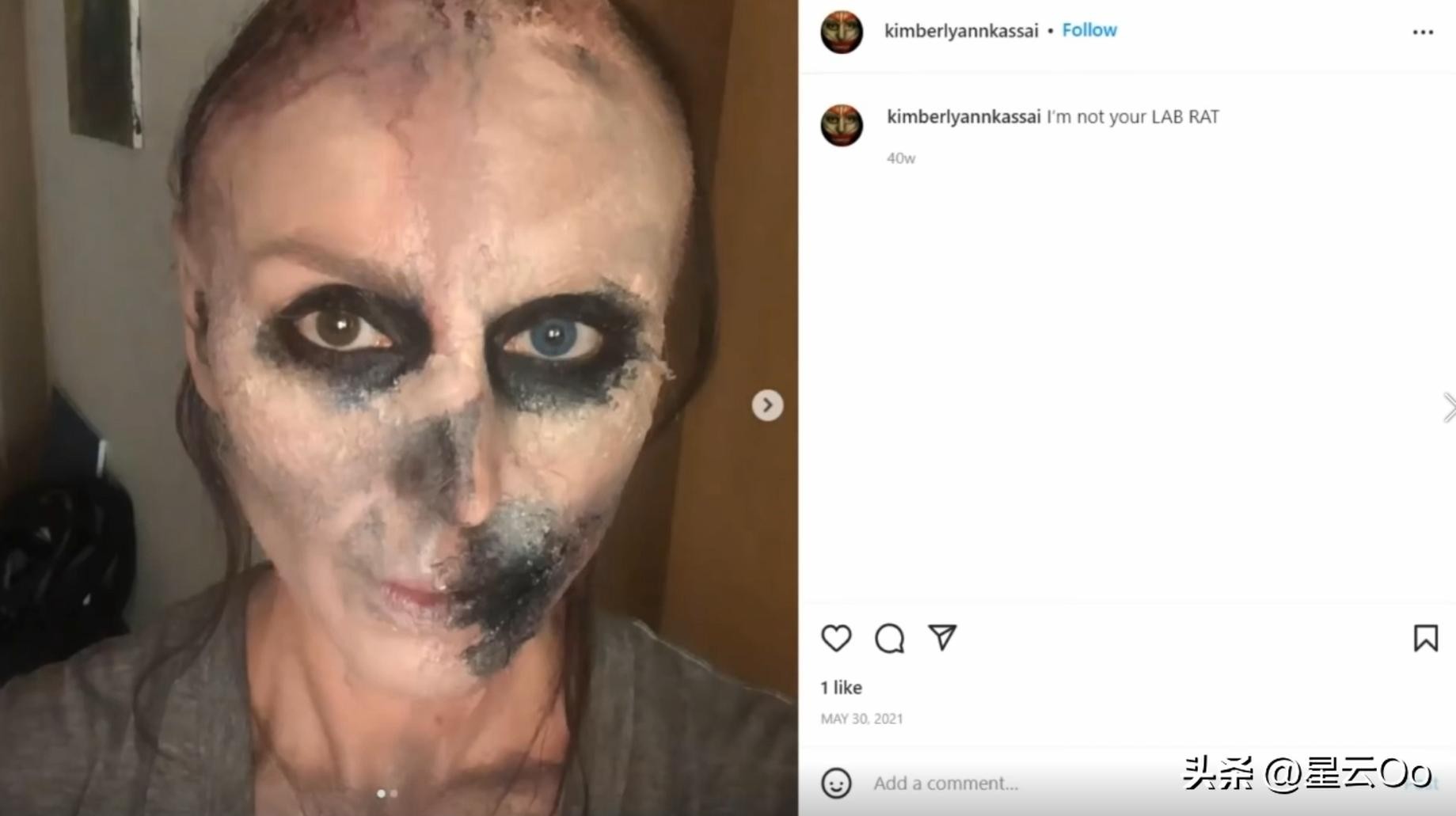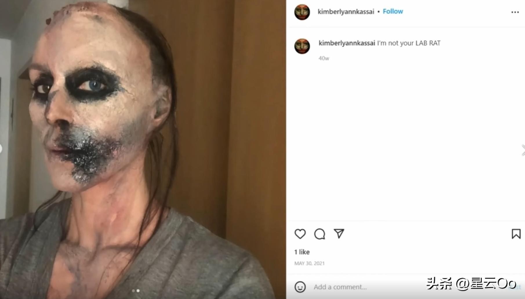 但丽贝卡还是通过各种手段找到了这个丧尸女的名字,“金伯利卡塞尔” ,顺藤摸瓜,丽贝卡很快就找到了这个人的社交媒体,账户,可以看到,在该事件发生后不久,金伯利卡塞就在脸书上拍下了这张照片,并且配文说,我不是你们实验室里的老鼠,之后,她又陆陆续续发布了一些内容来展示,自己是如何一步一步化妆成这个效果的。