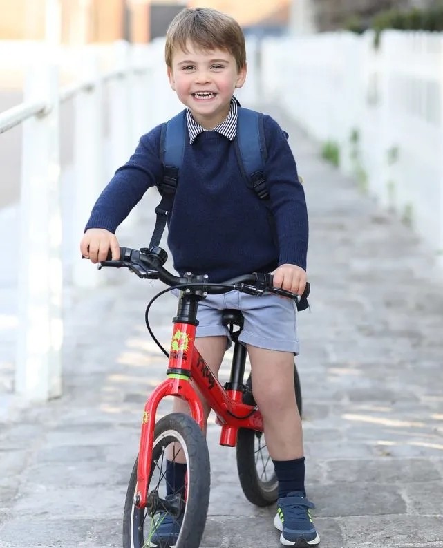 这是路易小王子3岁的生日官方照,穿着一身蓝色的毛衣亮相,看起来像是校服,骑着自行车的路易王子,活力感满满啊!