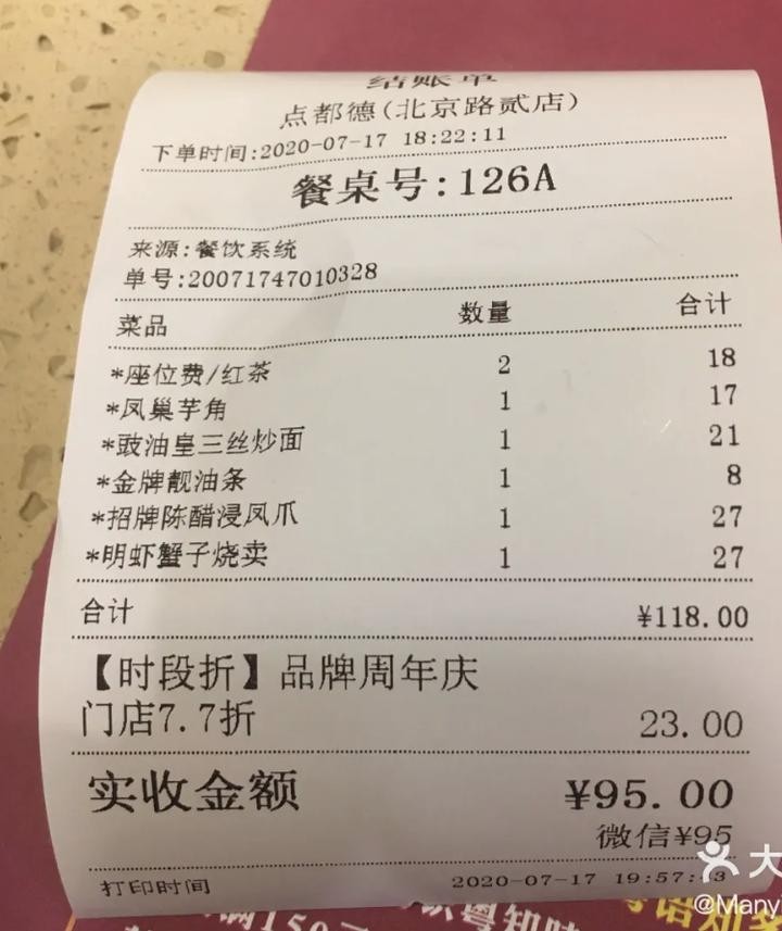 还有网友从APP里找到了一张广州点都德7月中旬的消费小票照片,图中显示,招牌陈醋凤爪和明虾蟹子烧卖的价格和杭州有明显区别。