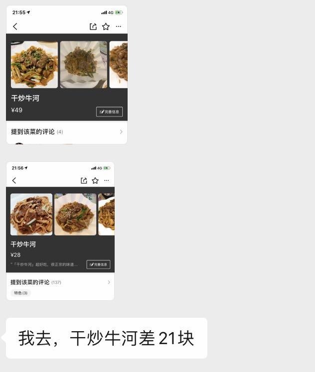 有人对比了干炒牛河的价格,两地之间竟然相差21元。