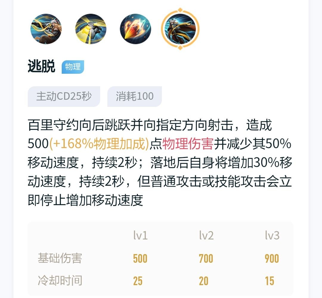 百里守约三技能:守约向后跳跃并向指定方向射击,造成500(+168%物理加成)点物理伤害。这是守约保命技能,防止被对方突脸秒杀。