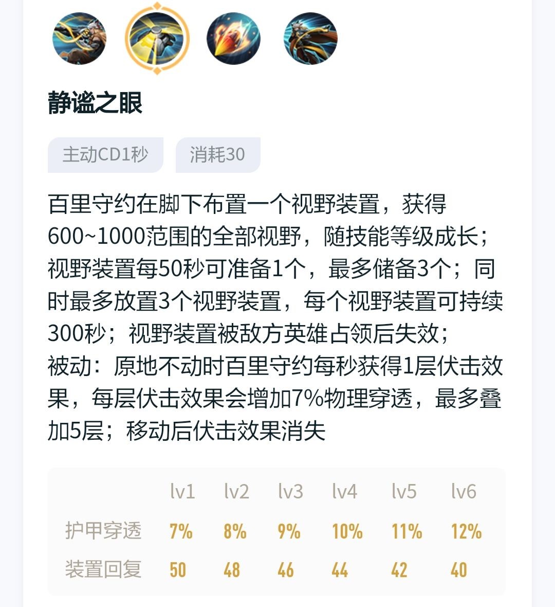 百里守约一技能:最多可以放置3个视野装置,每个持续300秒。这是百里守约非常关键的技能,虽然守约保命能力比后羿鲁班强,但还是不够灵活。一技能能洞察敌方位置,防止线上被GANK,发育能力比一般射手强。