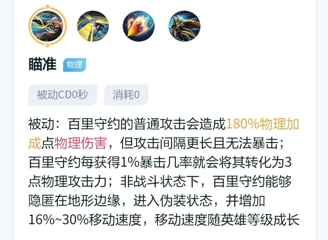 百里守约被动:1.普通攻击会造成180%物理加成点物理伤害,但攻速慢且无法暴击:2.每获得1%暴击几率就会转化成3点攻击力;3.非战斗时,能隐匿在地形边缘,进入伪装状态,增加16%~30%移速。