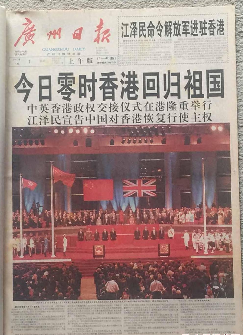 1997年七月的广州青年报纸上,“香港回到祖国怀抱”这几个鲜红的大字显眼地刊登在报纸的首页。即使是有些昏暗的图片上,也能清楚地看到中国国旗、英国国旗与香港行政区区旗,共同屹立在灯火辉煌的香港国际会议展览中心。