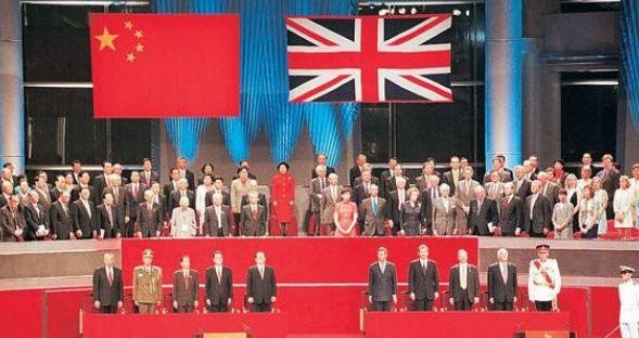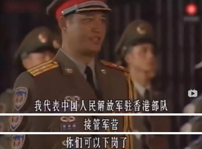 一位身着中国军队戎装护旗手站在旗杆之下,手握中华人民共和国国旗,与英国护旗手交接。这名光荣的交接仪式护旗手名叫谭善爱,他用底气十足清晰洪亮的声音对英国指挥官爱利斯说“我代表中国人民解放军驻香港部队接管军营,你们可以下岗,我们上岗!”英国国旗降下,中国五星红旗缓缓上升,香港特别行政区结束了英国的殖民统治,正式回归祖国。