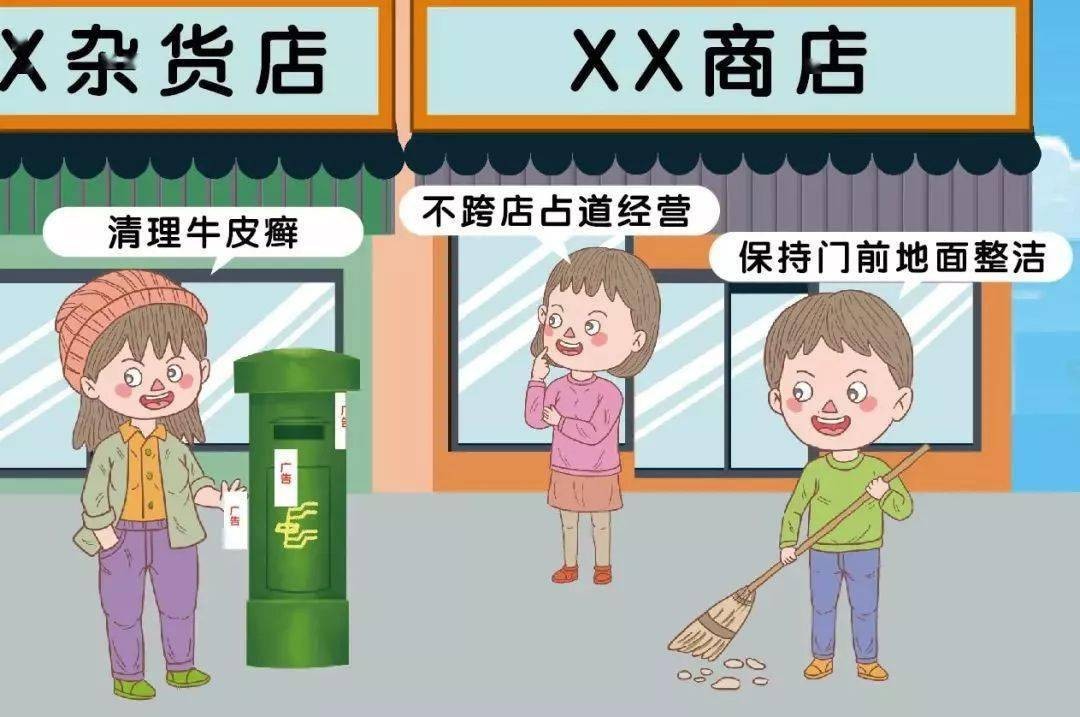 即建筑物立面保持整洁,按规定设置门头招牌和夜景灯光,不延伸店堂外占道经营;制止乱堆放和乱挂物品、乱摆摊设点、乱停车辆、乱搭乱盖、乱画乱贴和其它有碍市容环境秩序的行为。