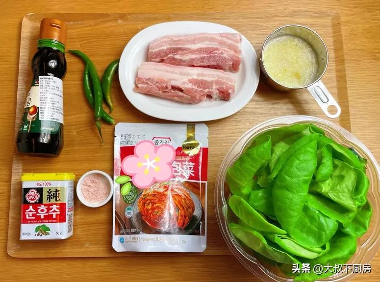 食材:五花肉条180g、蒜泥30g、韩国芝麻油30g、韩国楜椒粉3g、韩国泡菜1份、生菜包菜1盒、青辣椒(可省略)3条