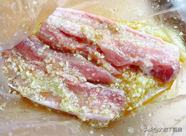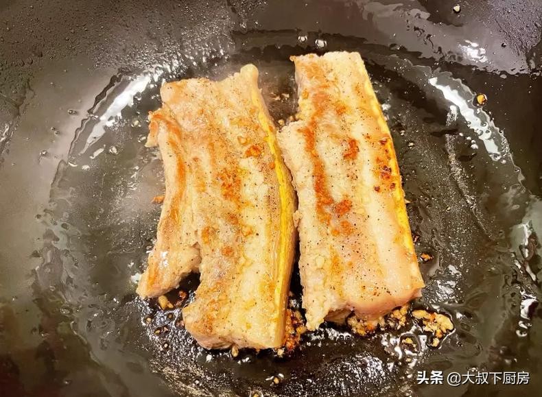 2、在袋子中放入五花肉条把酱料和肉混合均匀。包上袋子后再按摩揉约10下即可放入冰箱冰2-3小时。本次使用铸铁锅烤肉(可用烤箱烤)锅子不加油干烤,烤完一面再翻面烤至表皮金黄色夹起,再用厨房食物吸油纸把油擦干。