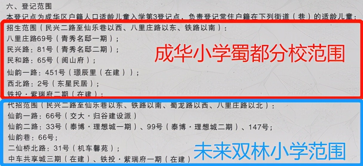 别急,插播一条重要信息先:双林小学分校开学前,成华小学蜀都分校将代为招生。我们看下这两个学校划片是咋个起的。