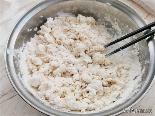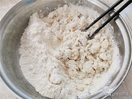3.接下来,再淋入冷水,一边淋水,一边用筷子搅动,把剩下另一半的面粉,也搅拌成絮状,这是一半面粉用冷水和面,把两种水温和的面搅在一起,搅匀。这个就是用半烫面的方法和面,一半用热水,一半用冷水,如果单用用冷水和面,做出的韭菜盒子的皮稍硬。全部用开水和面,做出的韭菜盒子的皮比较粘牙。用半烫面的方式和面可以中和两者的缺点,这样做出来的韭菜盒子的外皮不仅柔软,而且不粘牙。就是把韭菜盒子放凉了,面皮也是柔软如初,不会变硬。这是做韭菜盒子和面的小技巧。