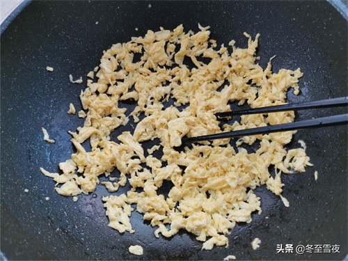 6.锅内加入油,油量多加一些,把油炼制一下,多余的油,拌馅用。如果是色拉油就不用炼制,用生油做出的馅料有生油味,把油加热至冒烟,关火,把油舀出来一些,放置一边晾凉待用,马上把鸡蛋液淋入锅内,用筷子不停的在锅内划圈搅动,把鸡蛋液利用锅的余热就可以搅拌成小块,这样炒出来的鸡蛋块就很碎,而且是非常均匀的小块,炒出来的鸡蛋也很嫩,把鸡蛋块盛出晾凉。