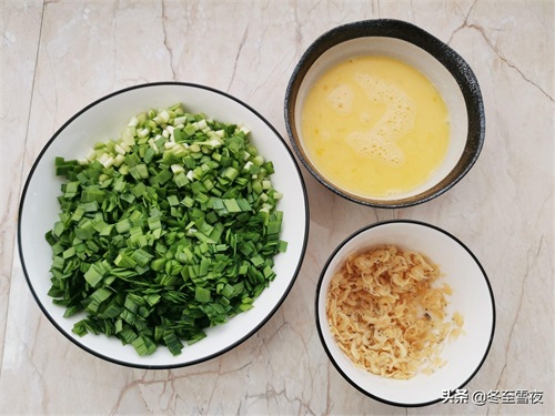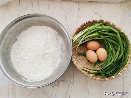 【韭菜盒子】所需材料:面粉2碗、鸡蛋3个、韭菜半斤、虾皮2汤匙、油盐适量、白胡椒粉1茶匙、