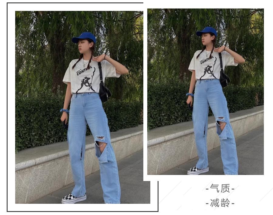 这件浅蓝色的破洞裤在膝盖和膝盖内侧都做了破洞的处理,拖地的长度能够大大地展现出长腿女孩们的优势。