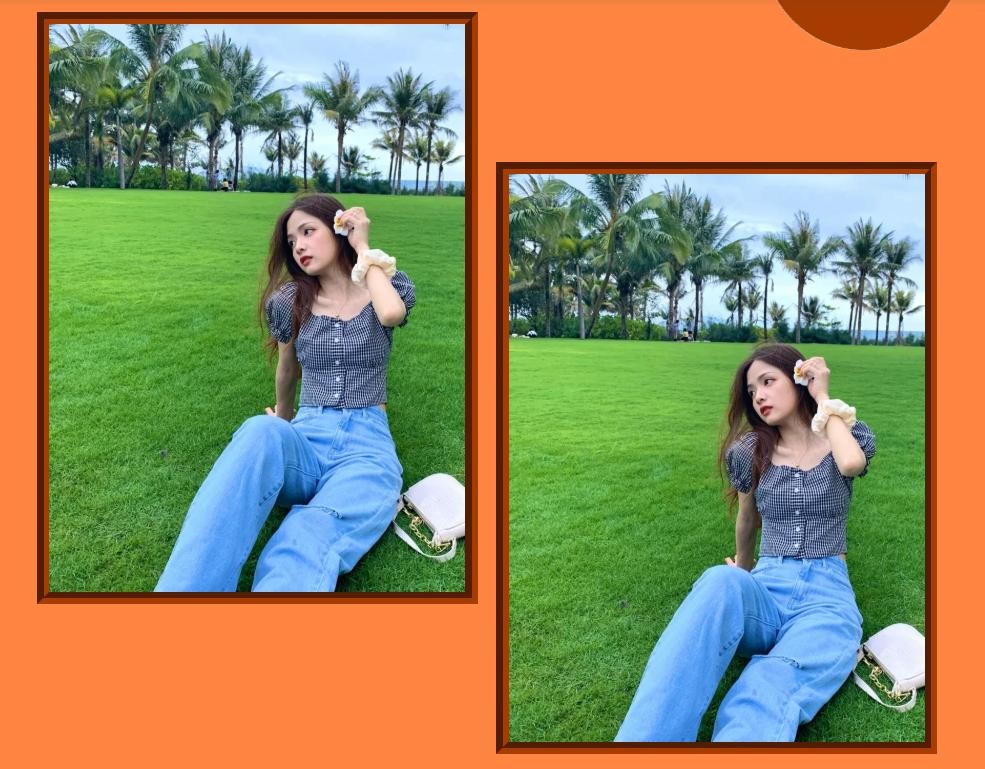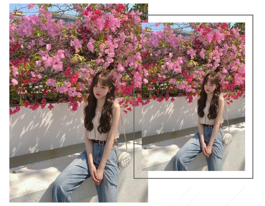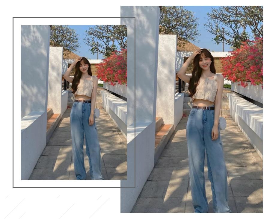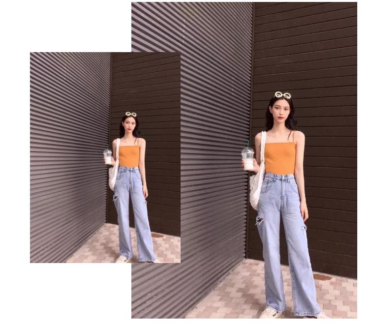 这款浅色的牛仔裤在裤腿侧面进行破洞的处理也是极为简约的,裤脚微喇的设计看上去十分帅气,配上这件橘色的吊带衫,好身材完全被显示了出来。