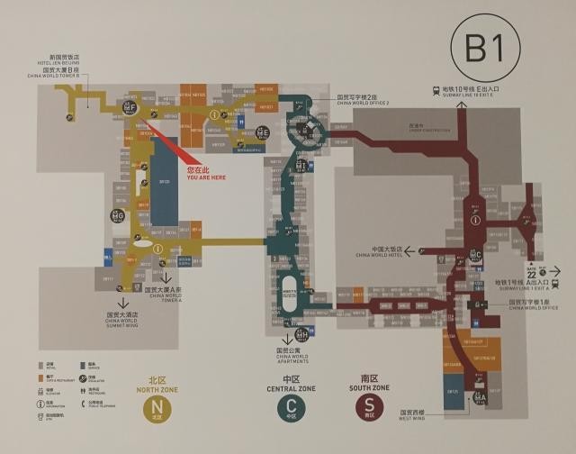 下面就是北京国贸商场B1层地图,从这里可以看出庞大的走廊,在地下将北京国际贸易中心的几座大楼联系在了一起。