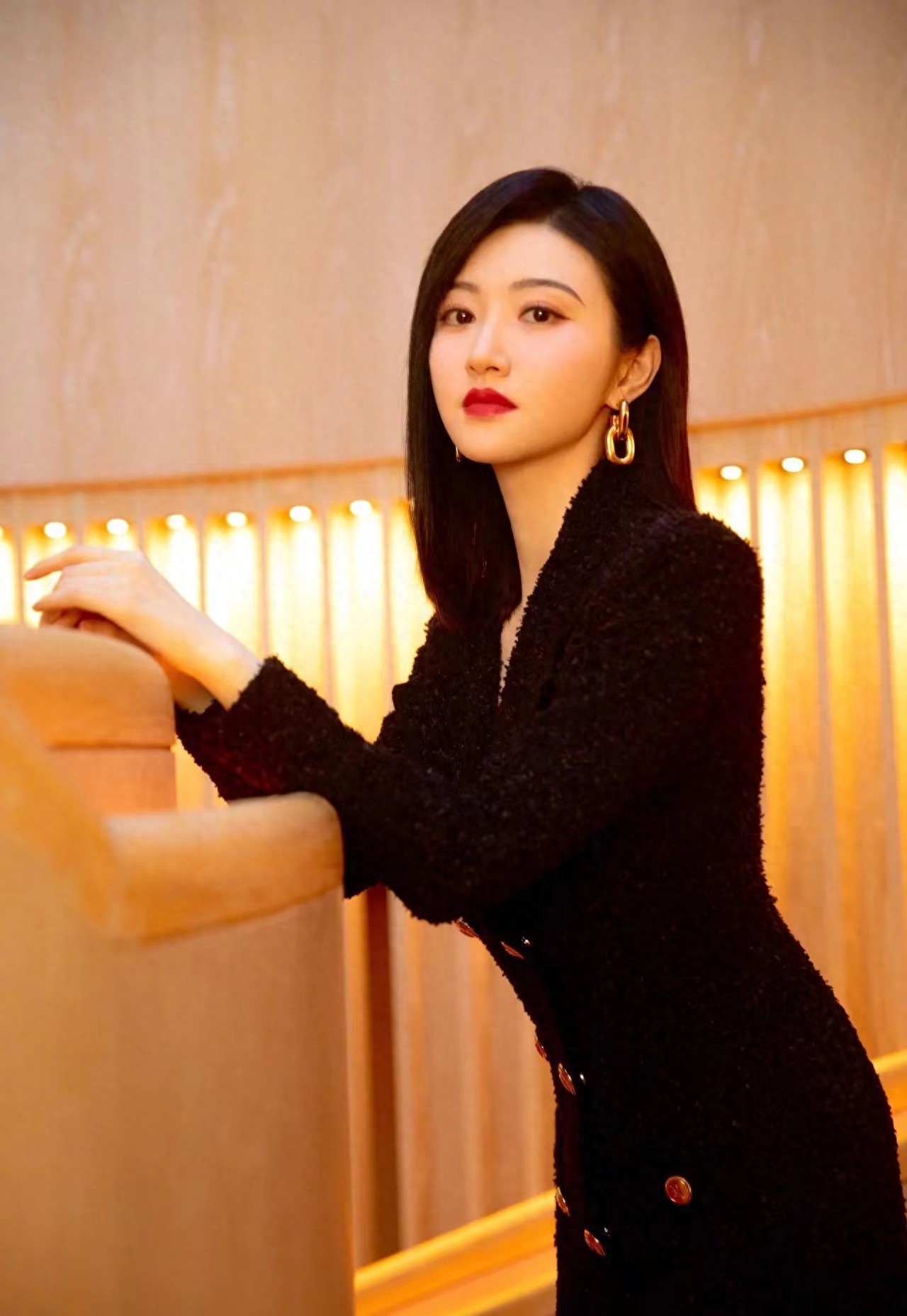 这组照片中,景甜身穿一条黑色蕾丝开叉长裙,展现出她纤细的美腿。妆容精致,五官立体,整体造型彰显了一种轻奢的新时尚感。黑色长裙的选择不仅沉稳大气,更巧妙地修饰了身材曲线,彰显了她的气质。