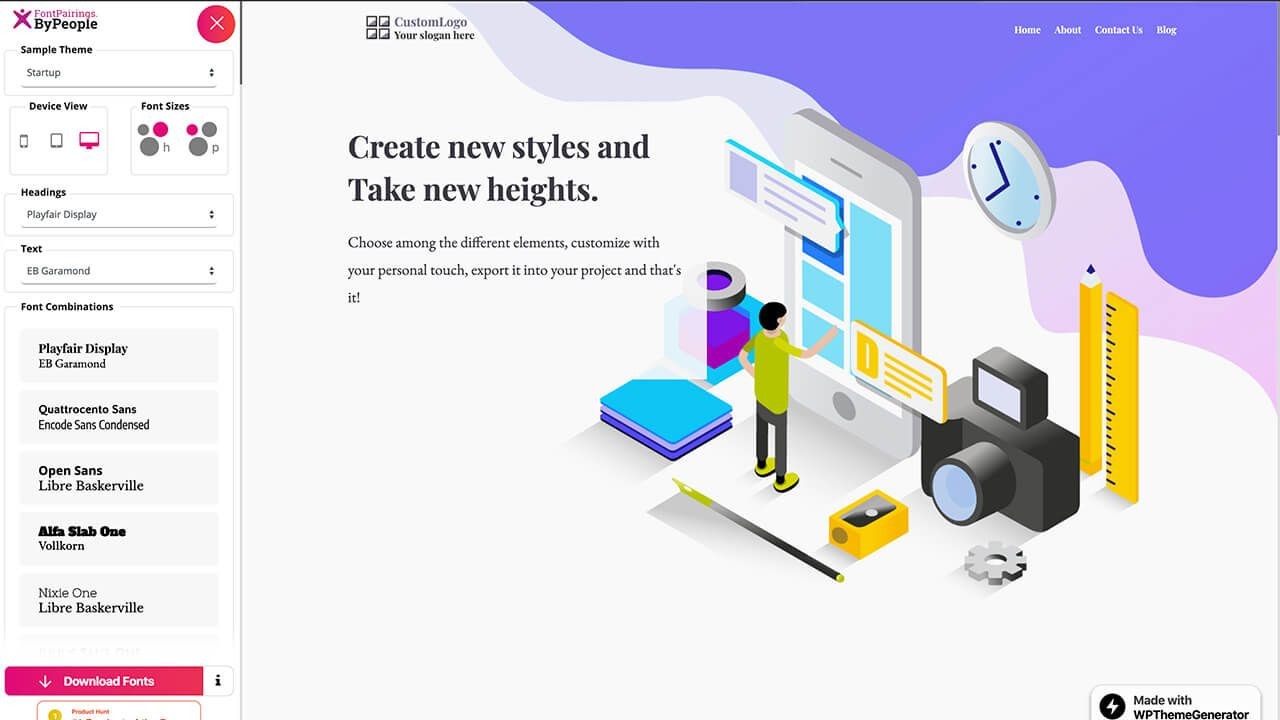 FontPairings.ByPeople可以一键查看不同的字体组合在不同的网站主题模板上的外观,让我们更直观的看到网站、手机端、iPad端显示的字体效果。