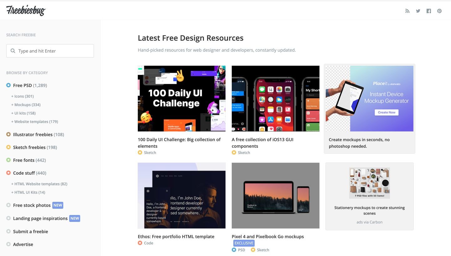 Freebiesbug汇集了图标、设计素材、样机、字体、网站模板、代码素材等各种资源的,网站内容有高质量的网页模板,各式各样的UI套件和样机,还有很多免费可商用的字体、图标等资源。
