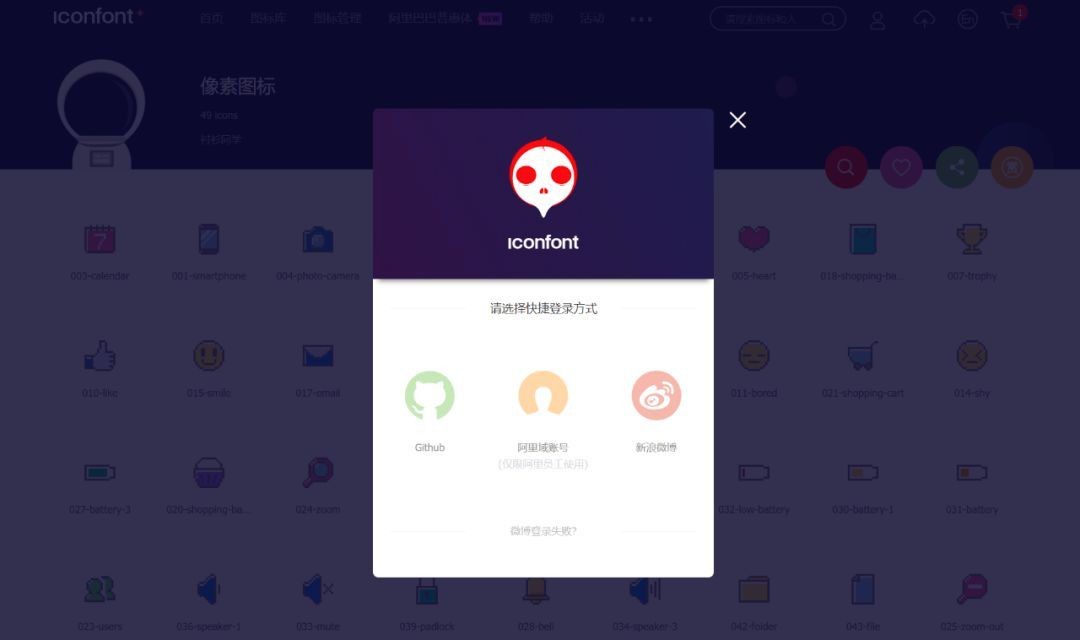 下载素材之前,需要进行登录操作,网站提供了三种快捷登录的方式:使用Github/阿里域/新浪微博账号登录。